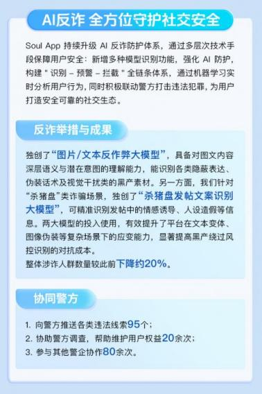 在当前网络诈骗手段日益隐蔽和多样化的背景下,Soul App在与公安机关紧密协作的同时,“图片/文本反作弊大模型”和“杀猪盘发帖文案识别大模型”两大核心技术模型的协同使用,也极大地提升了平台在面对文本变体、图像伪装等复杂多变场景下的识别精度。报告显示,在过去半年中,Soul App在反诈方面取得了丰硕的成果:发现并推送网络谣言线索50个,累计推送各类黑灰产线索25个,协助警方查明盗用照片、侵犯用户权益的案件20余次,共计处理警方调证协作需求80余次。