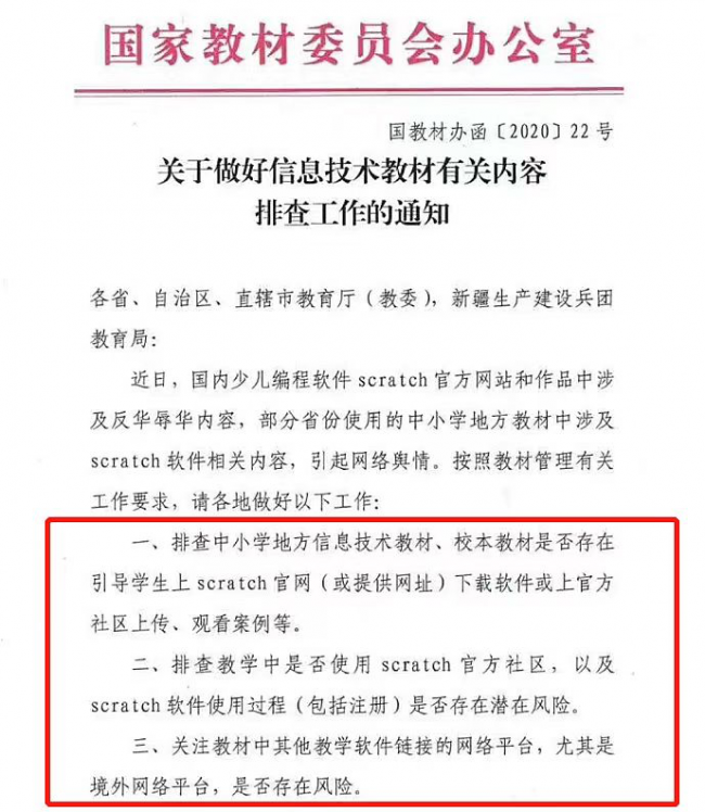 国家教材委员会办公室发布排查Scratch软件的工作通知